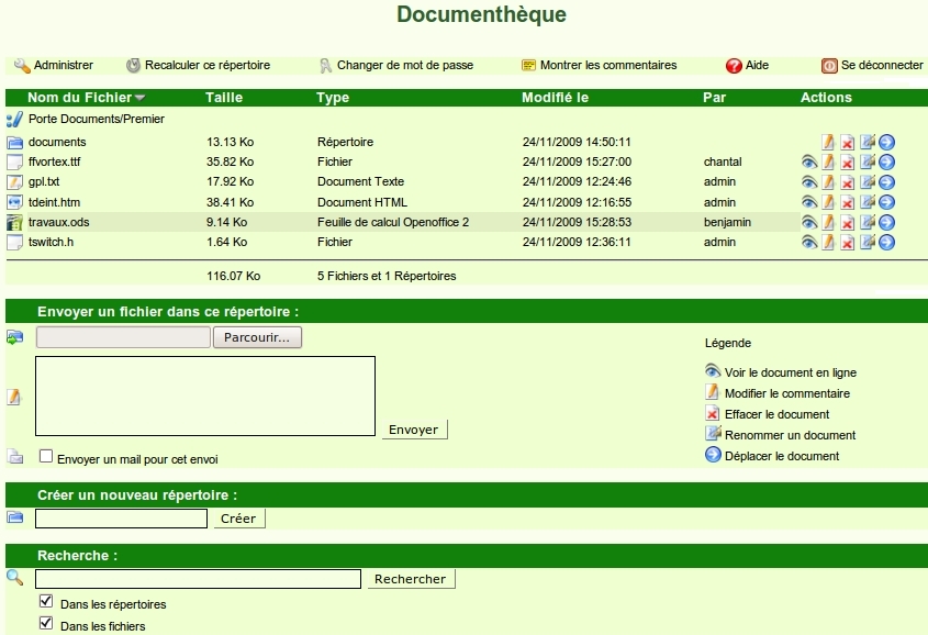 Ici, il suffit d'indiquer le nom du répertoire et ce cliquer sur créer, comme pour l'envoi des fichiers, il apparaît immédiatement dans le menu fichiers du porte-documents.