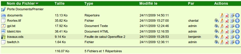 Nom du fichier : désigne les répertoires (icônes répertoires jaunes) et les fichiers (icônes représentative du type du fichier). Ici vous vous situez à la racine du porte-documents, comme l'indique l'icône :/. Il y a un répertoire intitulé "Archives" qui peut lui-même contenir des répertoires (il suffit de cliquer sur son nom pour l'ouvrir) et des fichiers, par exemple logo.jpg qui est une image comme l'indique l'icône précédent son nom.