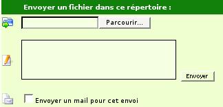 Si vous cochez la case "Envoyer un mail pour cet envoi", les destinataires que vous aurez indiqués dans la configuration du porte-documents et qui auront des droits de lecture sur le répertoire contenant le fichier (voir plus loin) seront avertis de l'arrivée de ce nouveau fichier. Le fait de cliquer sur le bouton Envoyer. déclenche l'envoi ; dès la fin de celui-ci le fichier apparaît dans le menu fichiers, assorti de son commentaire (si vous n'avez pas désactivé l'affichage des commentaires dans le menu général).